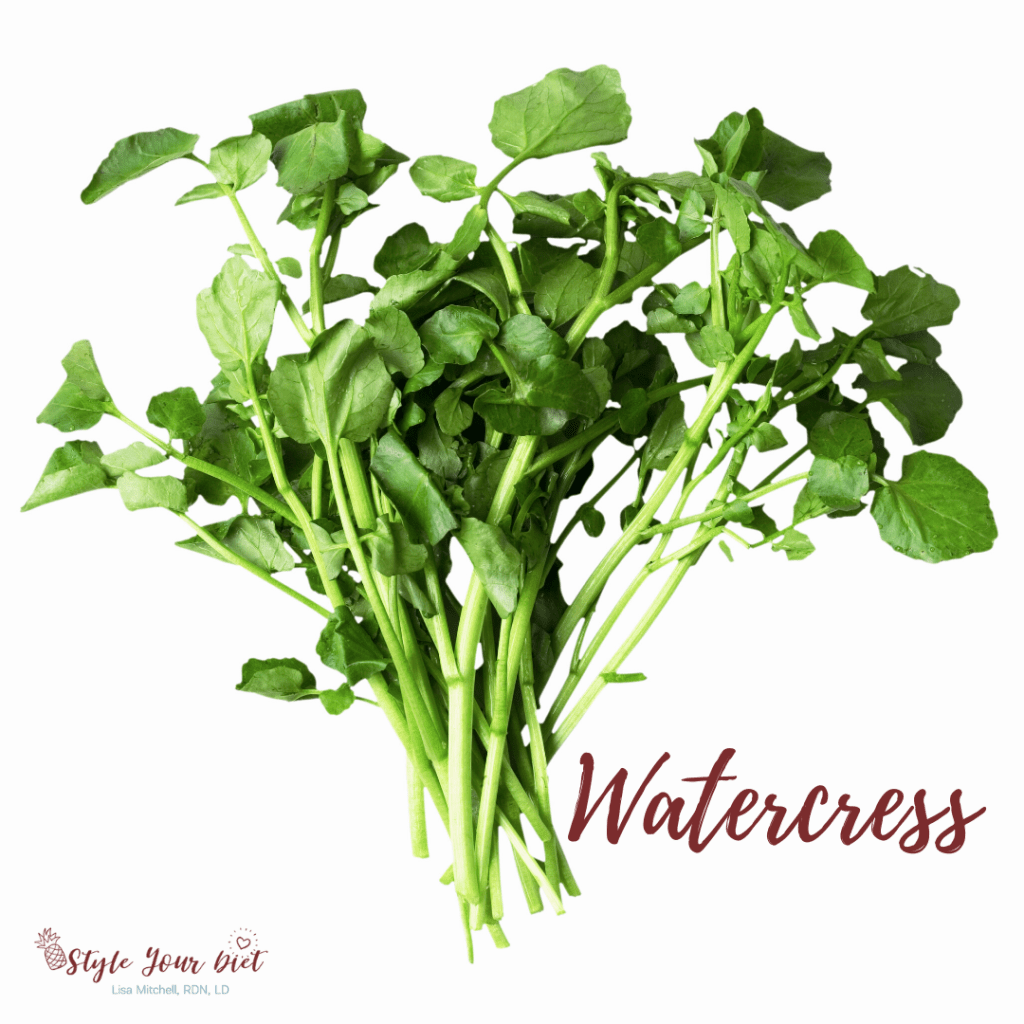 Watercress is a cruciferous vegetable with long stems and small, circular leaves. It makes a great sandwich topper in place of traditional leaf lettuce for a fun presentation. Just add a little bit of vinegar and olive oil to this bright, peppery veggie! You can also drop it into soups just before serving for an explosion of flavor. One of our favorite salads includes watercress, cucumbers, and radishes – fresh and delicious!