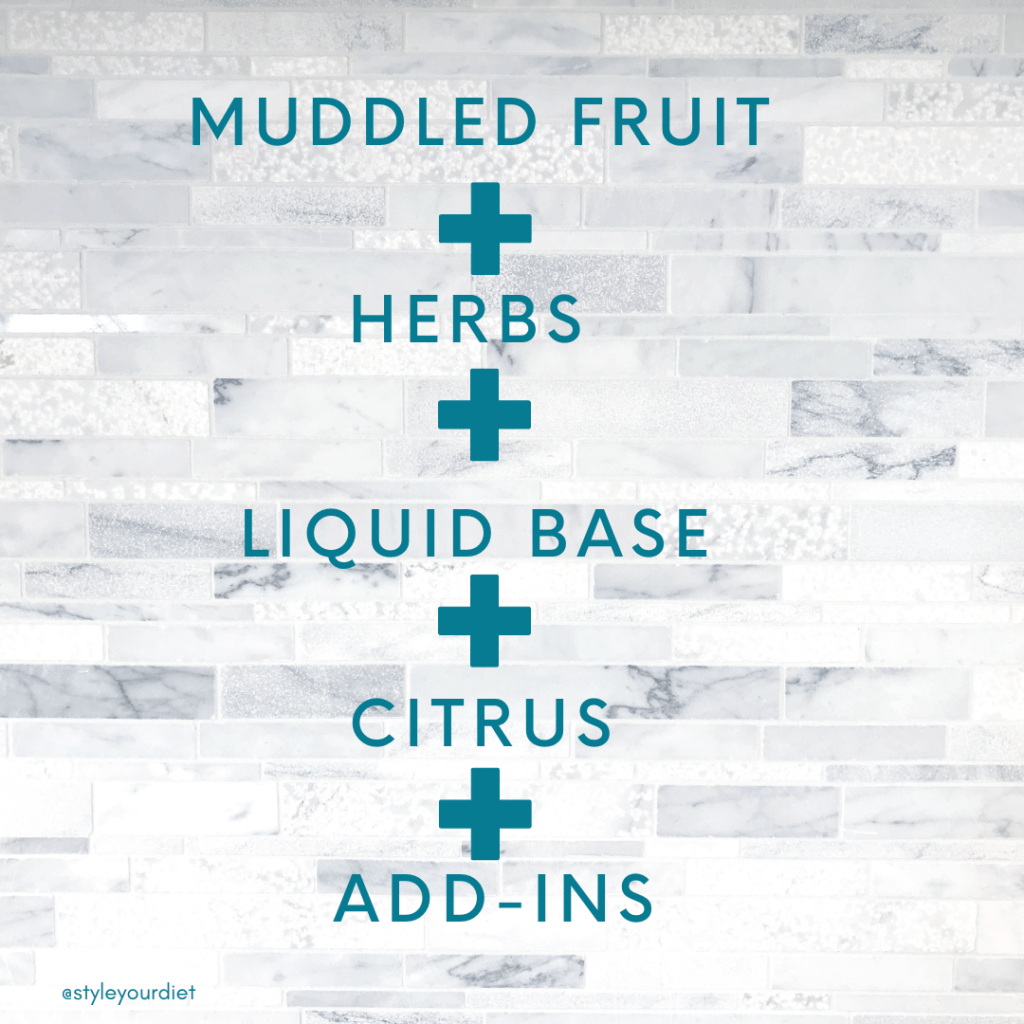 Sometimes we are looking for something a little less blah… The lemon wedge is always a nice touch, but we’re often wanting more. Let’s talk about some fun ways to jazz up water and transform your water from hydration to styling libation. Here is a simple style formula with some recipes to try: