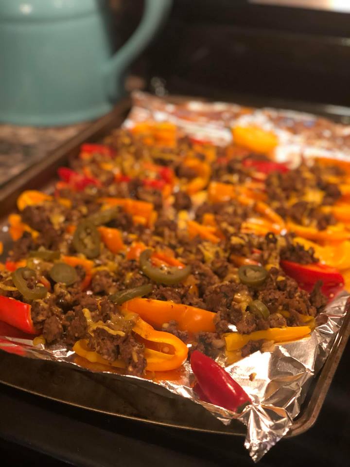Meanwhile, arrange the mini bell peppers in a single layer on the lined baking sheet. Fill each half with the meat mixture. Making sure you distribute the meat evenly over each pepper. Top with shredded cheese and jalapenos.